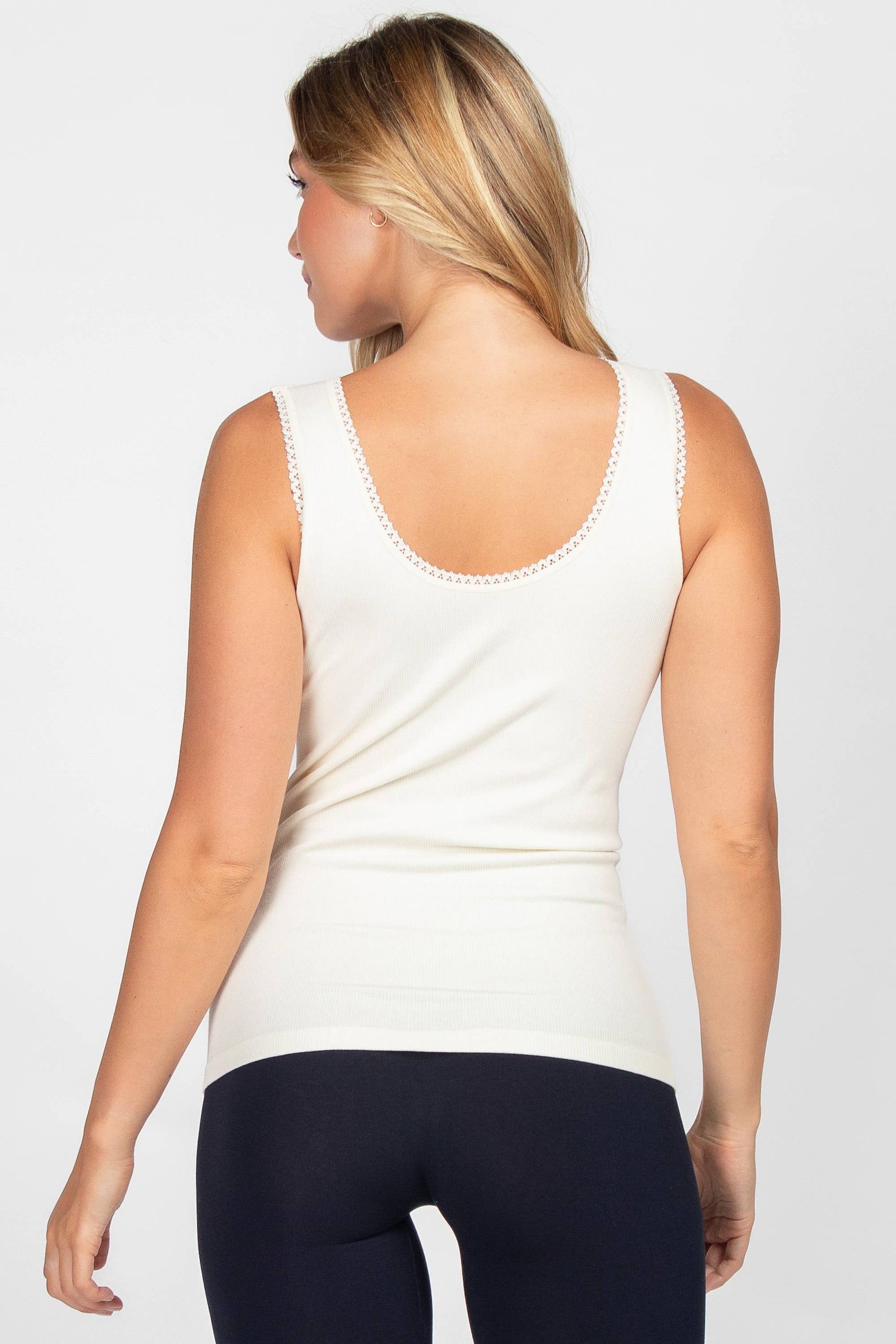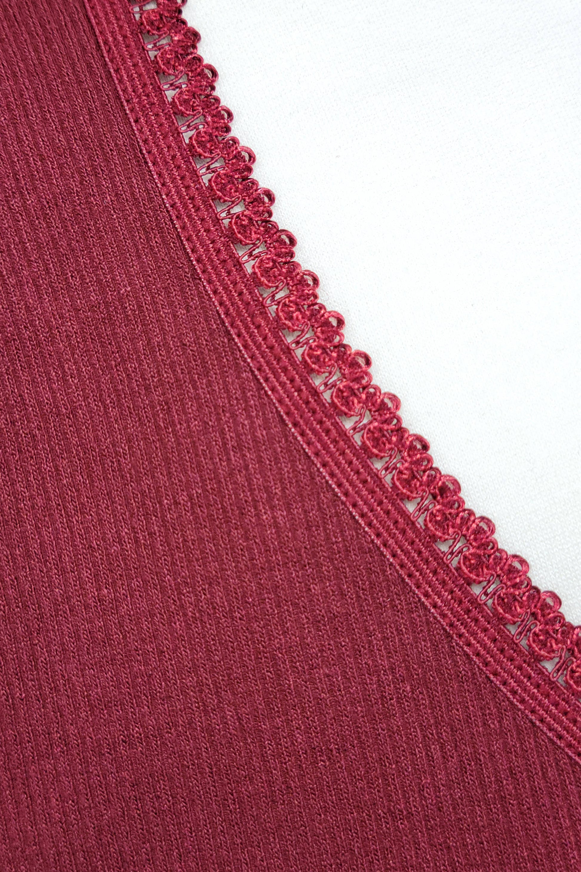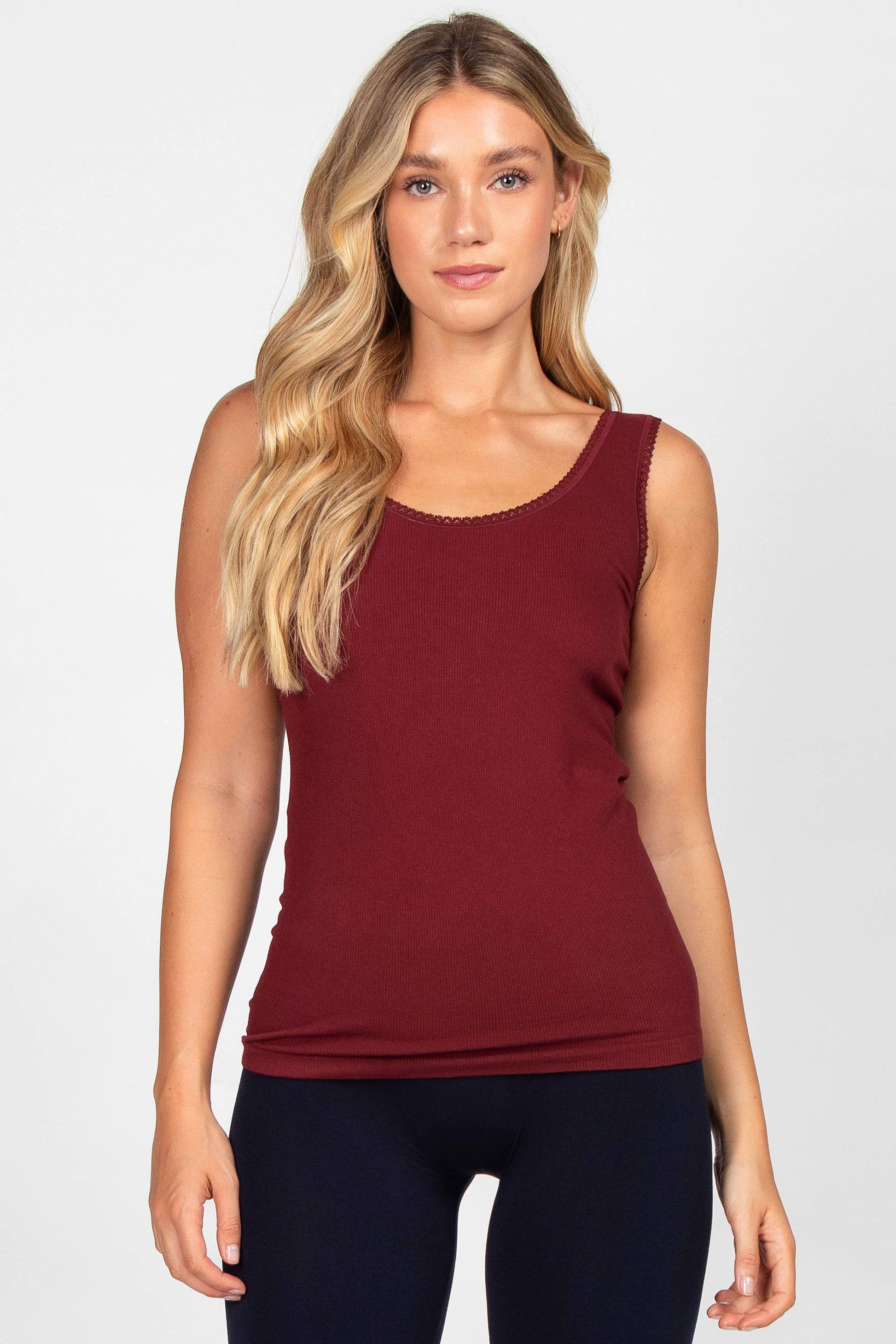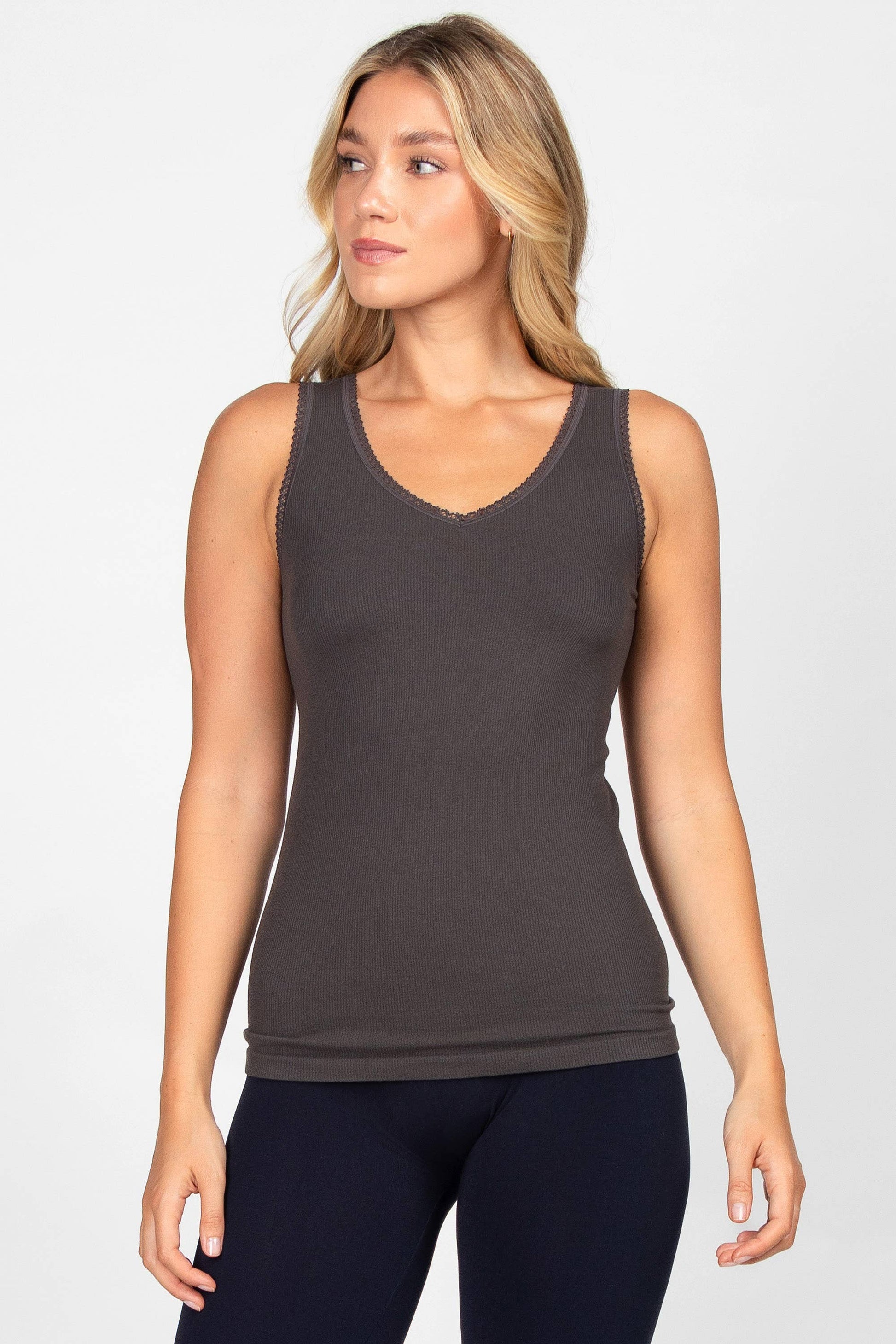 Based on our classic reversible v-scoop tank, this style is constructed with a soft, plush rib fabric that makes it perfect for cozy occasions. Dainty lace trim around the neck and straps adds a touch of romance. Form-fitting body.